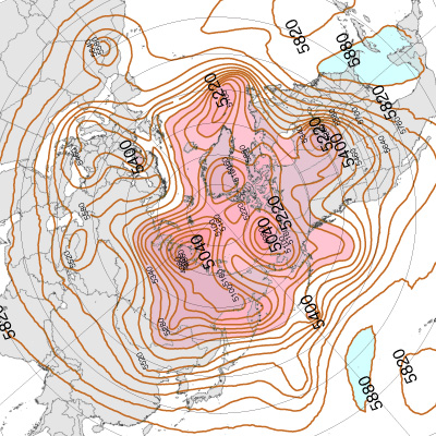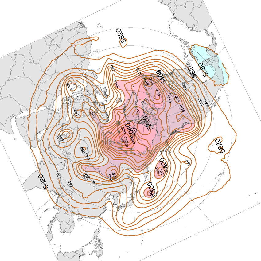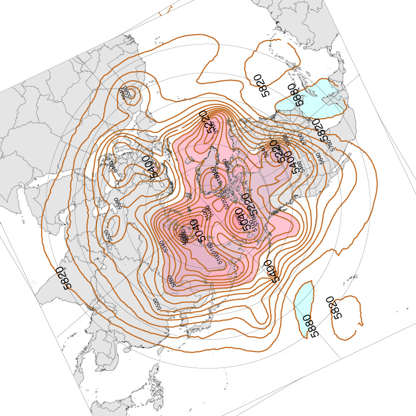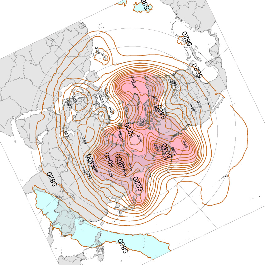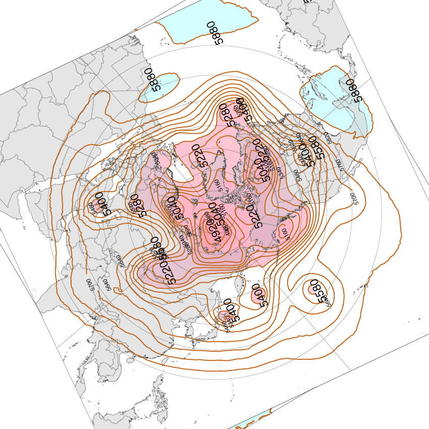 500 hPa 面天気図 (等高度線) は,高度に対し色分け。
