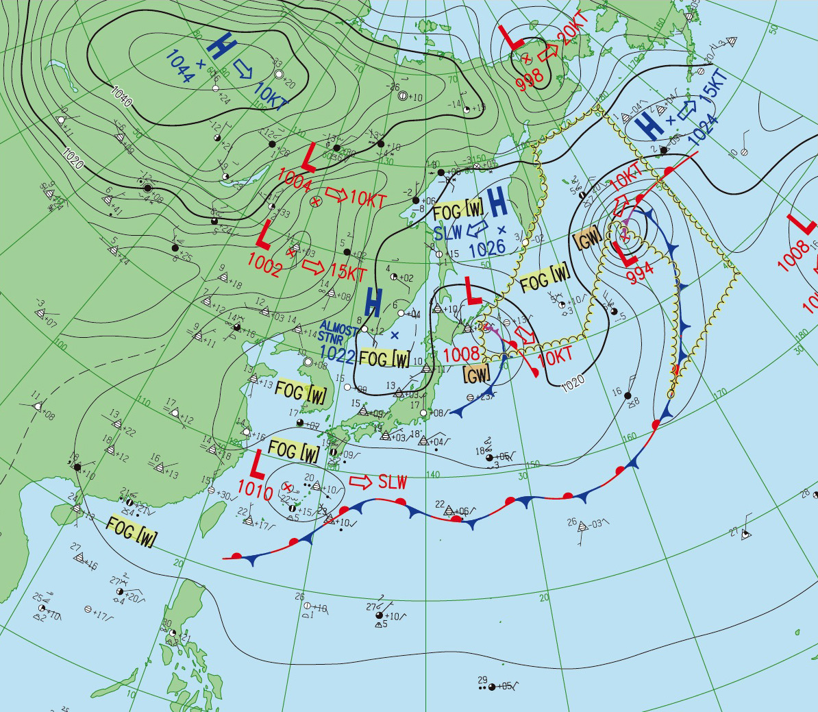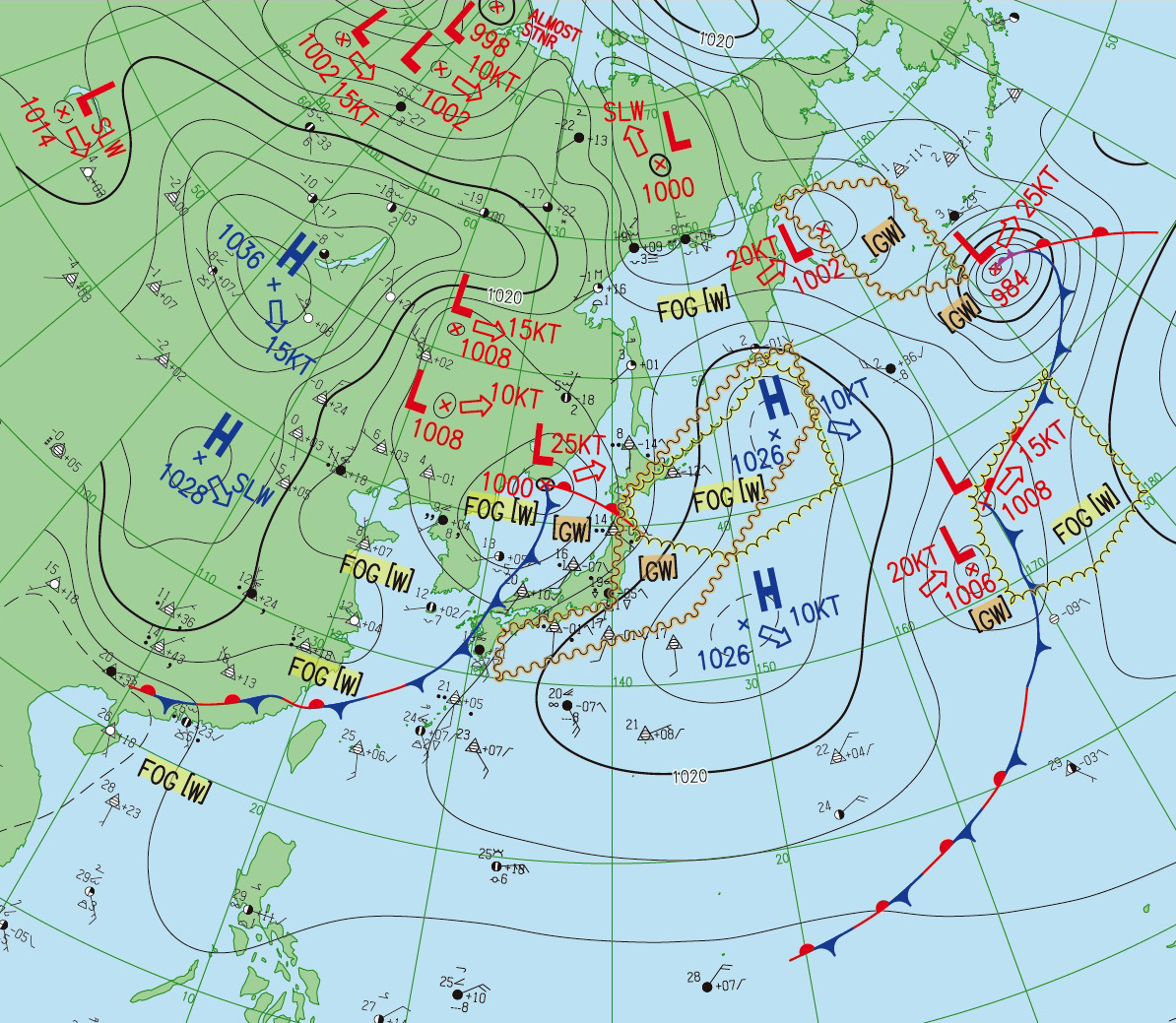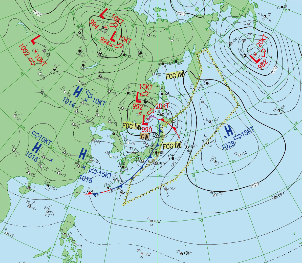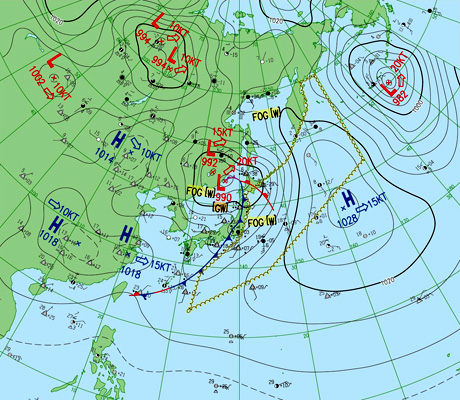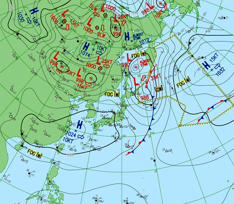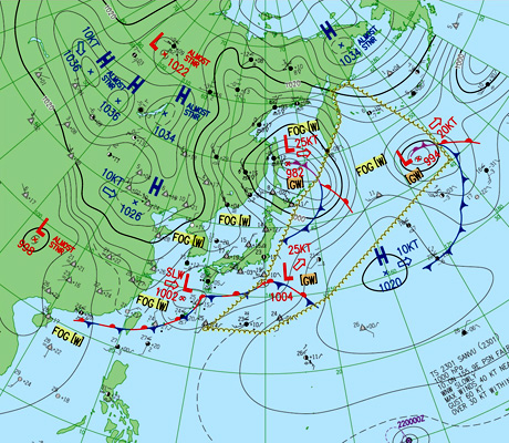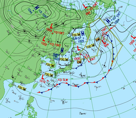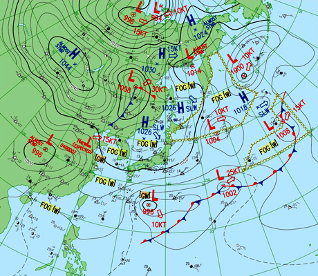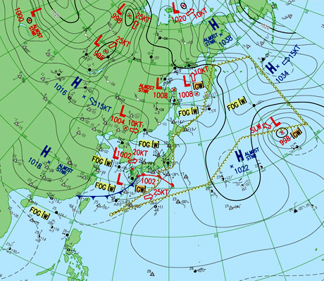 2つの北半球天気図はともに,縦の経線の下方に東京。