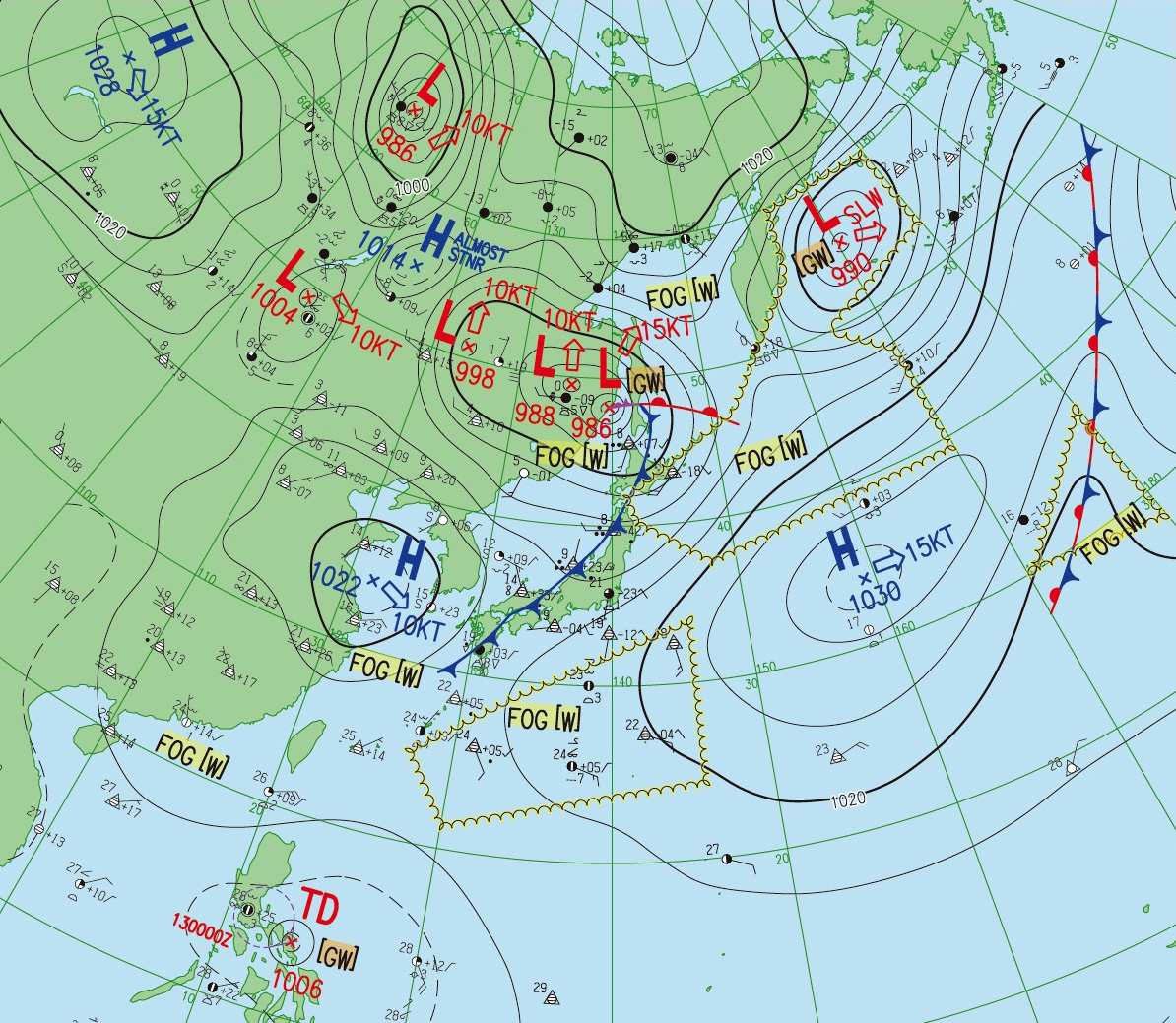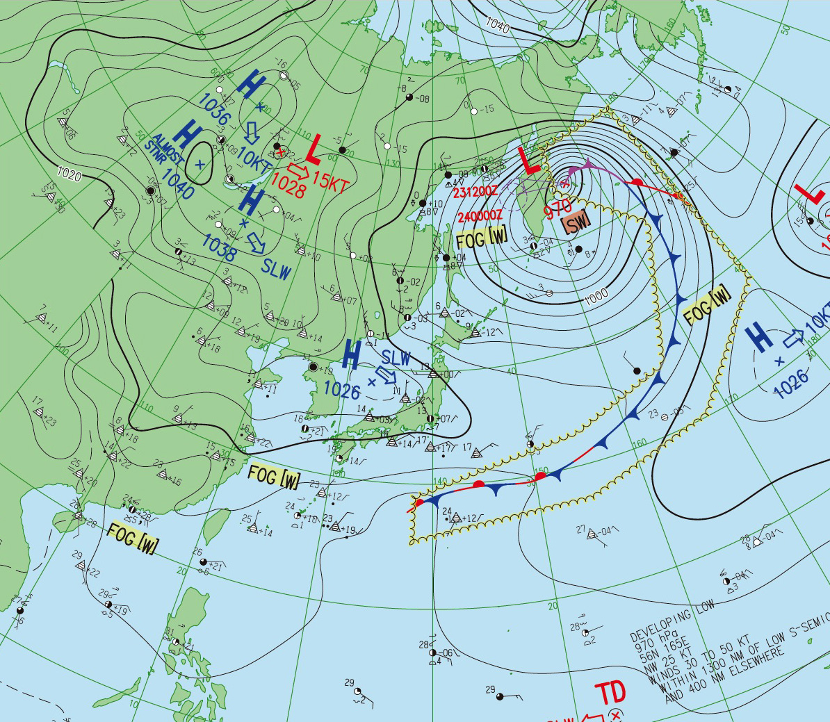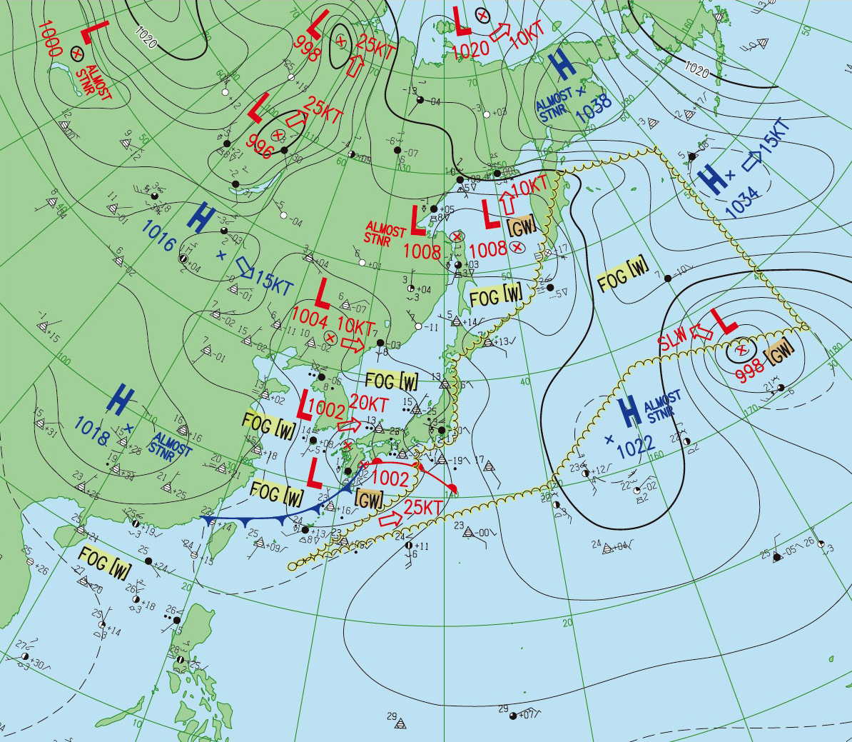 2つの北半球天気図はともに,縦の経線の下方に東京。