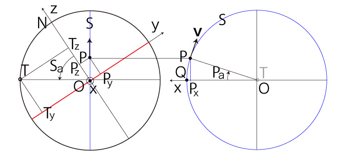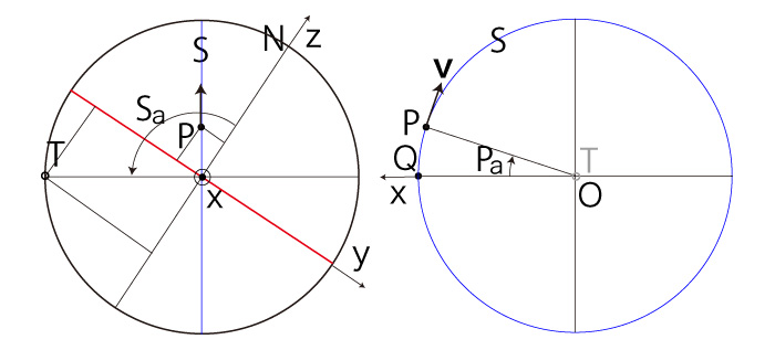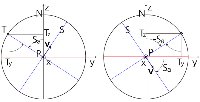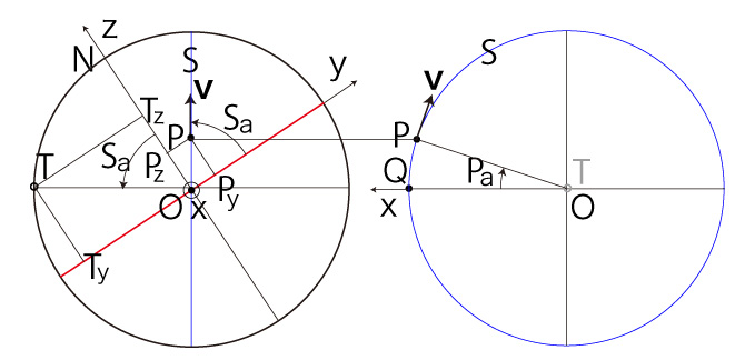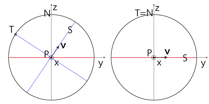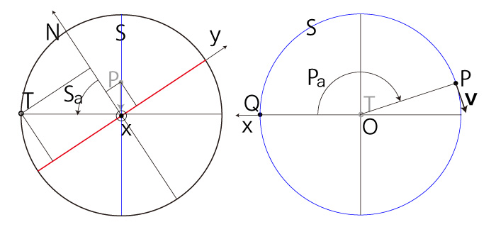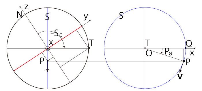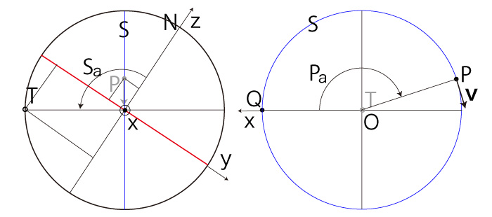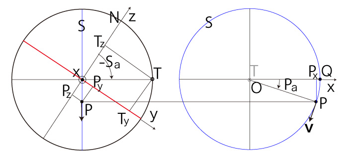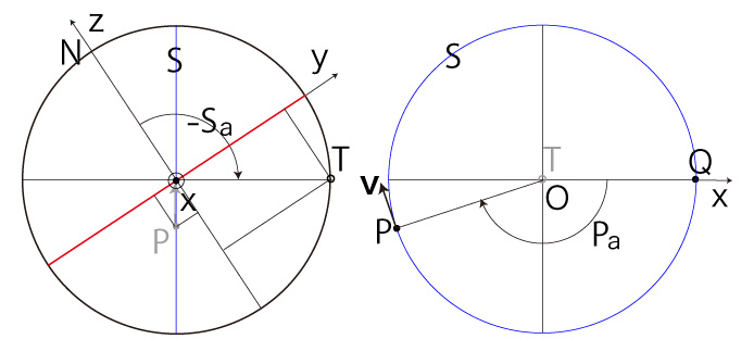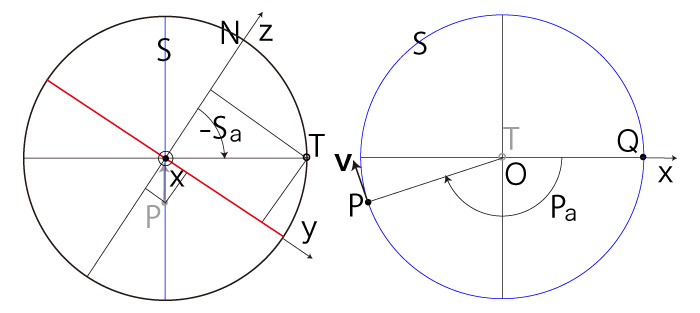 この式──以下「<式>」と呼ぶ──は,すべての場合で成り立つか? 以下,これを見ていく。 先ず,\( P_a = 0 \) は,\( P = Q \) ──即ち \( P_z = 0 \) ──を意味する。 \( S_a = 0 \) は,S が赤道であること──即ち \( v_z = 0 \) ──を意味する。 特に,\( S_a = 0 \) は \( P_a = 0 \) を含意する。 |