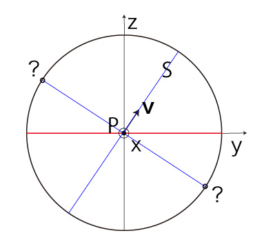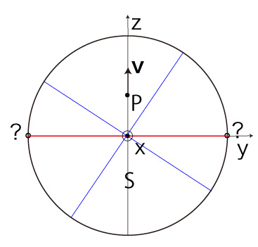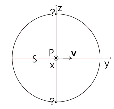 このとき \( T_z \) が \( \pm R \) のいずれであるかを決めるのは,赤道に乗っている \( \bf{v} \) の方向,即ち \( v_y \)。