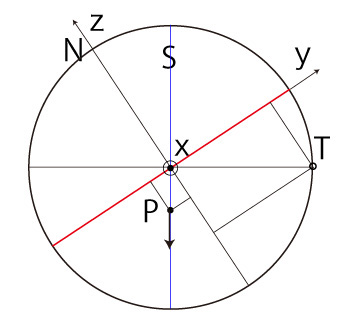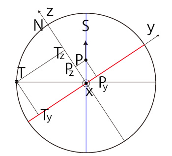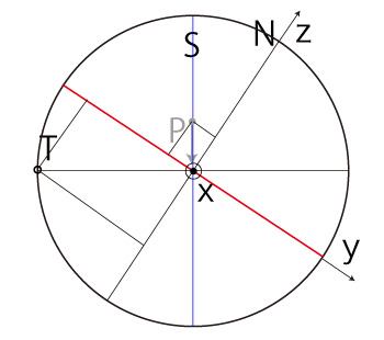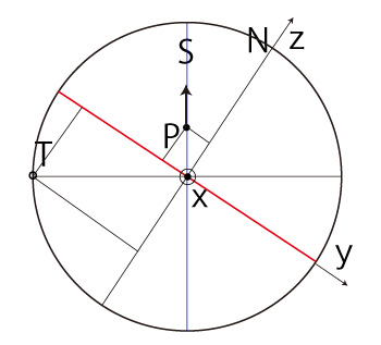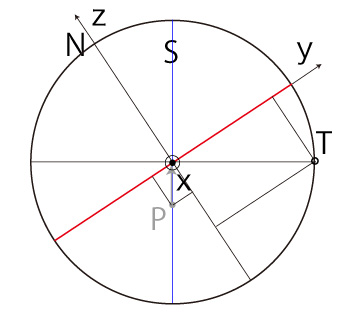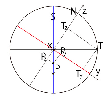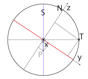 よって, \[ T_y = - R\ \frac{ P_z }{ \sqrt{ R^2 - P_x^2 } } \\ T_z = R\ \frac{ P_y }{ \sqrt{ R^2 - P_x^2 } } \\ \]