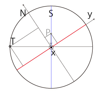 \( T_y,\ T_z \) については \[ P_y\ T_y + P_z\ T_z = 0 \\ T_y^2 + T_z^2 = R^2 \] から, \[ P_y^2\ T_y^2 = P_z^2\ T_z^2 = P_z^2\ ( R^2 - T_y^2 ) = P_z^2\ R^2 - P_y^2\ T_y^2 \\ P_z^2\ T_z^2 = P_y^2\ T_y^2 = P_y^2\ ( R^2 - T_z^2 ) = P_y^2\ R^2 - P_y^2\ T_z^2 \\ \ \\ \ \\ \ ( P_y^2 + P_y^2 )\ T_z^2 = P_z^2\ R^2 \\ \ ( P_y^2 + P_z^2 )\ T_z^2 = P_y^2\ R^2 \\ \ \\ \ \\ ( R^2 - P_x^2 )\ T_y^2 = P_z^2\ R^2 \\ ( R^2 - P_x^2 )\ T_z^2 = P_y^2\ R^2 \\ \]
