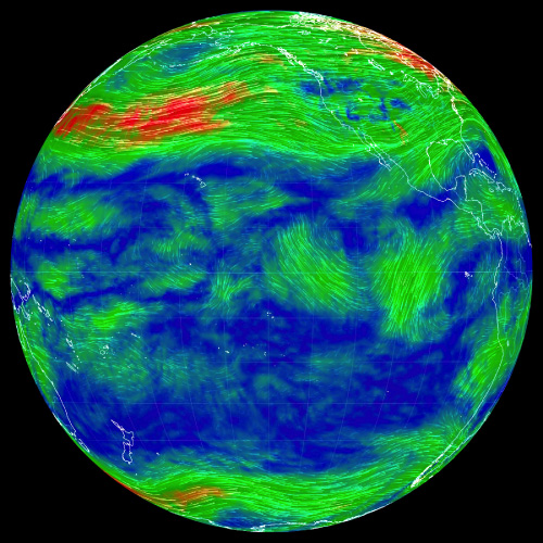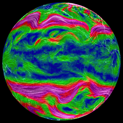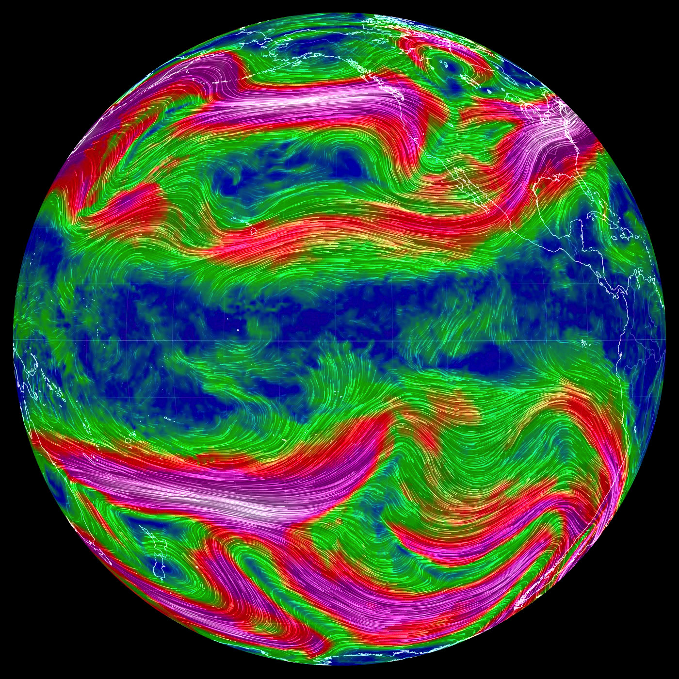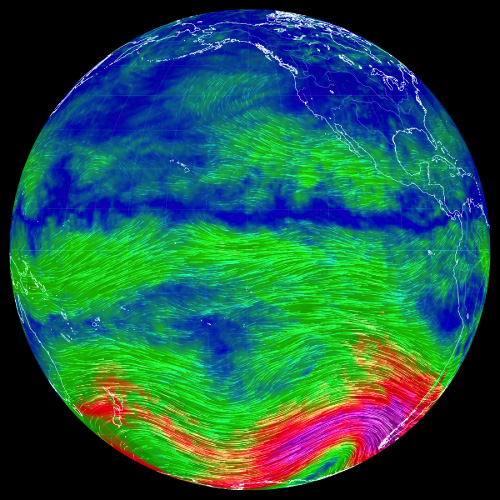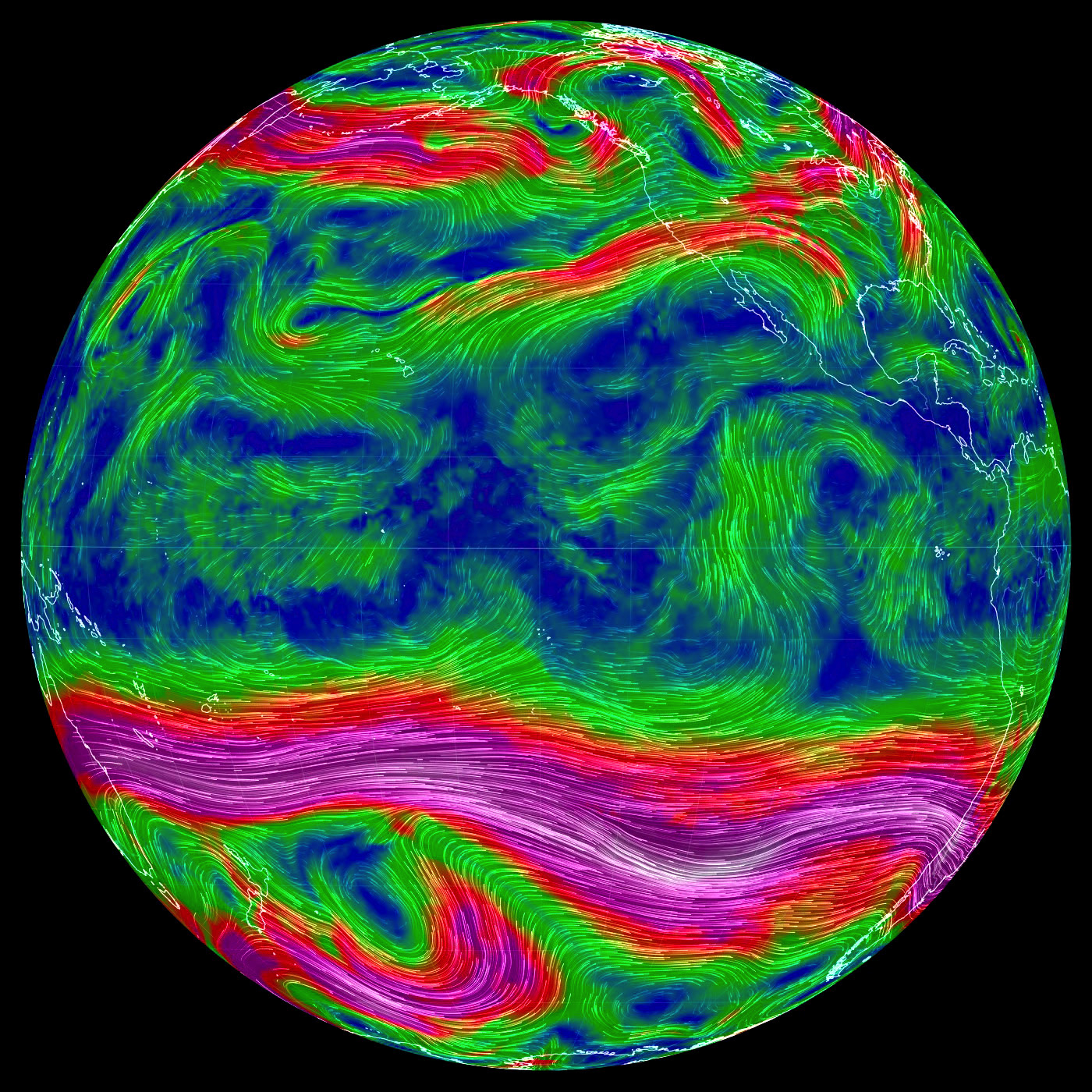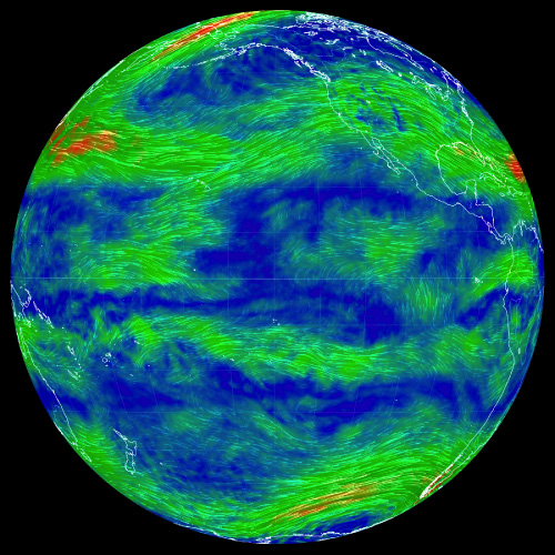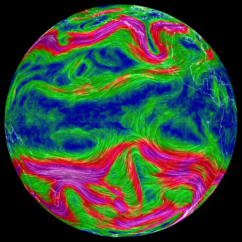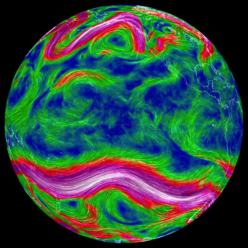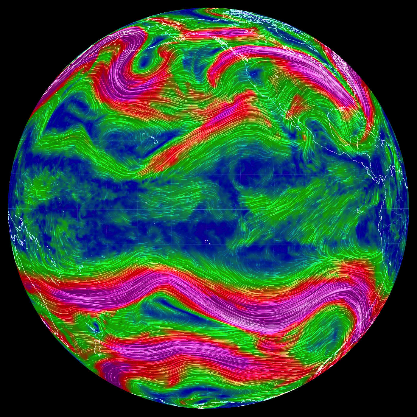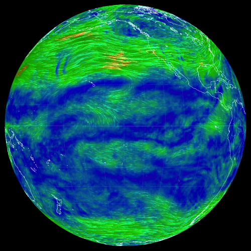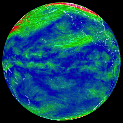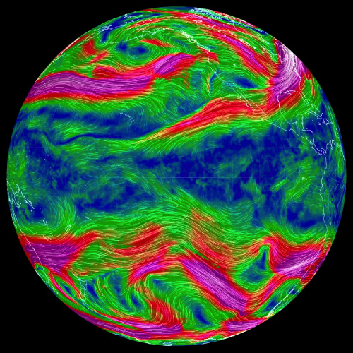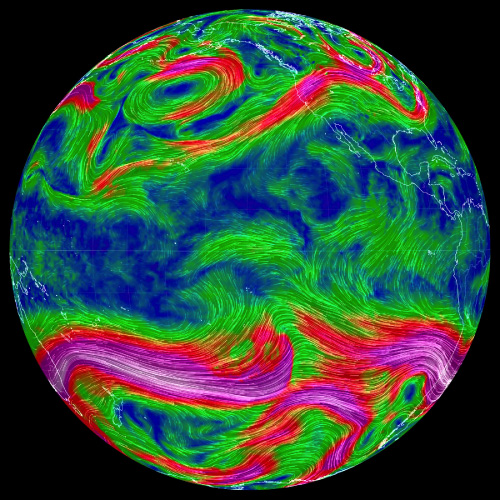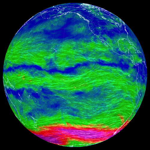 「赤道付近で上昇し緯度20–30度の低緯度地域で下降する気流」は,存在しない。 存在しないことは,実際に天気図にあたればわかる。 「熱帯収束帯」は,いまのような天気図をもてない時代の,机上の論 (妄想) である。 しかし気象学は,「熱帯収束帯」を固持し続けている。 それは,学者というのはだいたいが教条主義だからである。 天気図を見ず,教条のポンチ絵を信奉する。。 以下に,太平洋の 250hPa 面 (高度約11km) と 70hPa 面 (高度約 18.5km) の天気図を示す。 見ての通り,「赤道付近で上昇し緯度20–30度の低緯度地域で下降する気流」はもちろん,「定常的」と言えるような気流は存在しない。 |