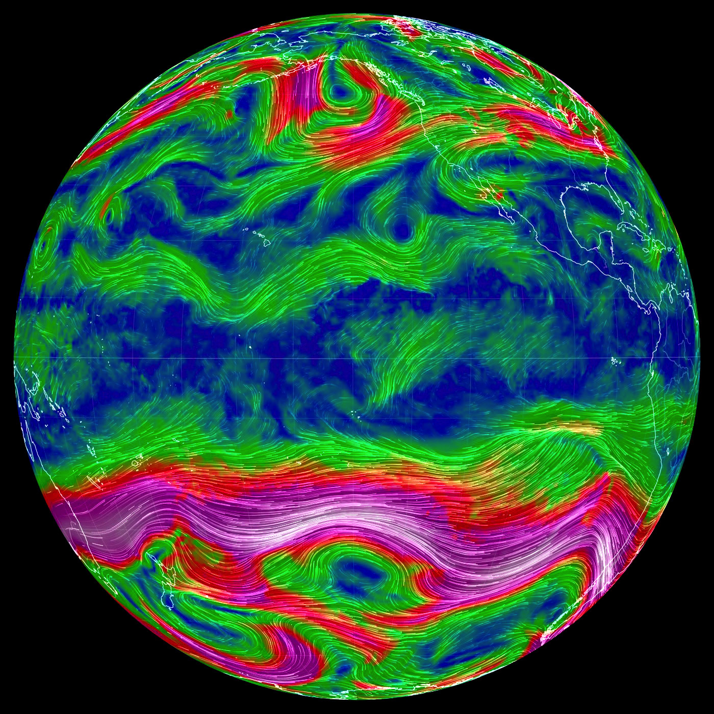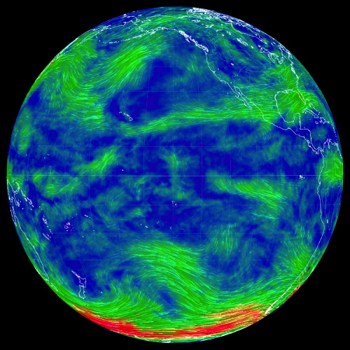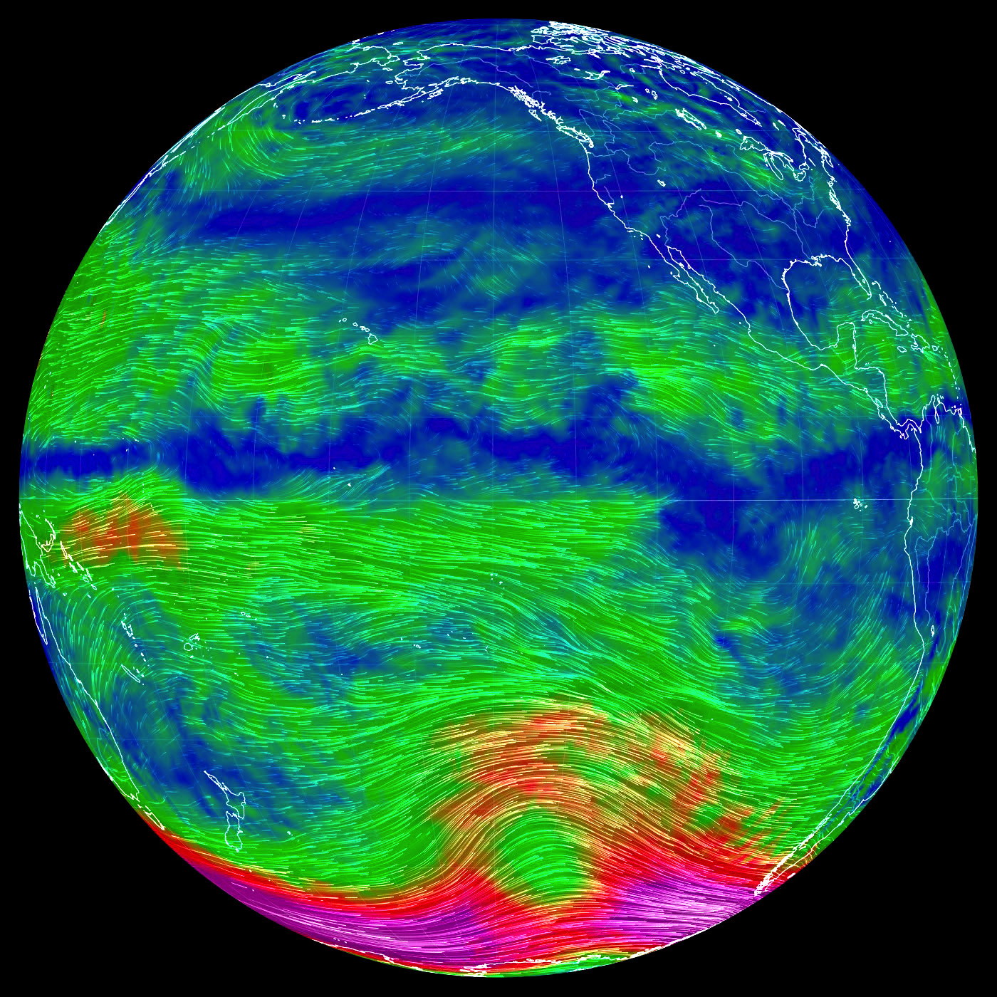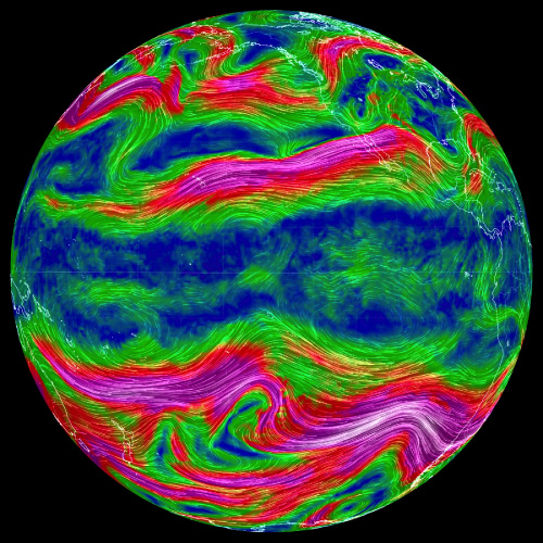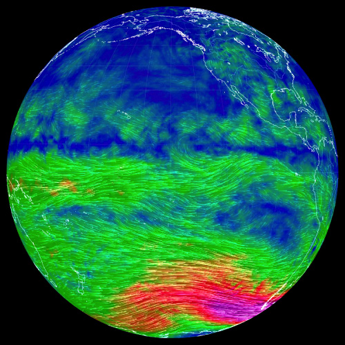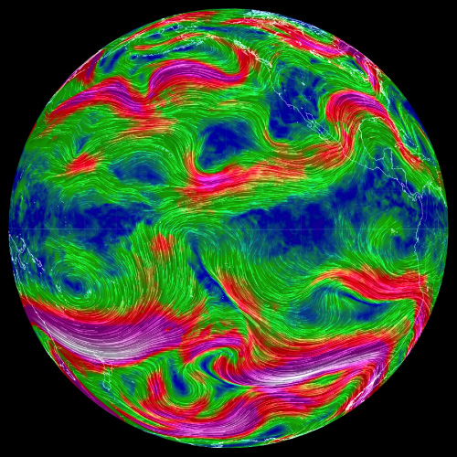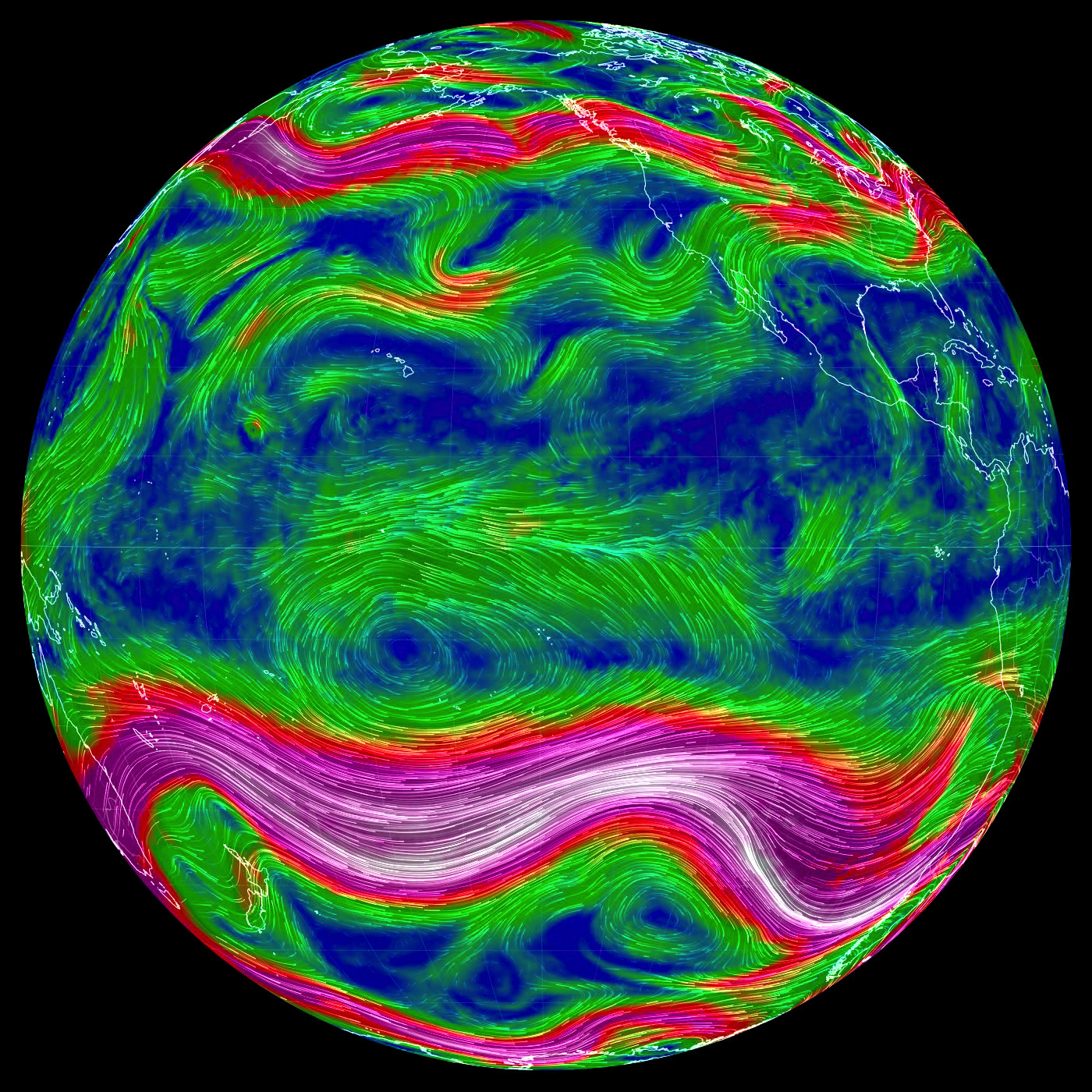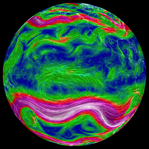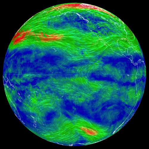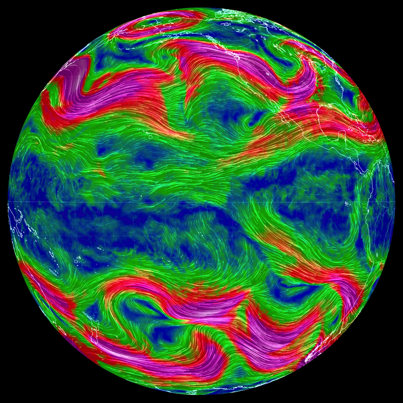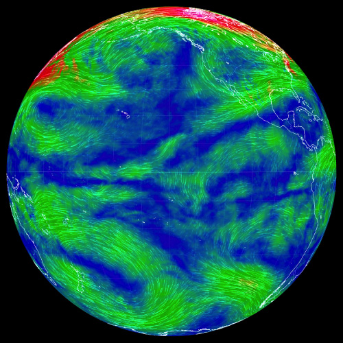 「赤道付近で上昇し緯度20–30度の低緯度地域で下降する気流」は,存在しない。 存在しないことは,実際に天気図にあたればわかる。 「熱帯収束帯」は,いまのような天気図をもてない時代の,机上の論 (妄想) である。 しかし気象学は,「熱帯収束帯」を固持し続けている。 それは,学者というのはだいたいが教条主義だからである。 天気図を見ず,教条のポンチ絵を信奉する。。 以下に,太平洋の 250hPa 面 (高度約11km) と 70hPa 面 (高度約 18.5km) の天気図を示す。 見ての通り,「赤道付近で上昇し緯度20–30度の低緯度地域で下降する気流」はもちろん,「定常的」と言えるような気流は存在しない。 |