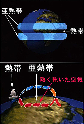 ひと,そして気象学は, 「赤道付近で上昇し緯度20–30度の低緯度地域で下降する気流」を,上に引用した絵で想っている。 その絵は,騙し絵である。 騙しのトリックは,「スケールをインチキする」である。 「赤道から緯度20〜30度」の距離は,緯度20度で計算すると:,