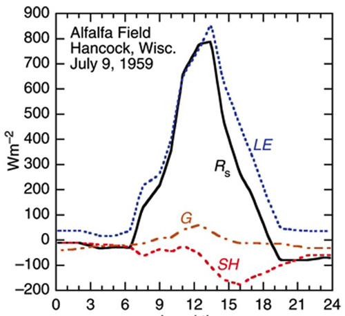 | LE | : | the latent heat flux from the surface to the atmosphere (evaporative cooling) |