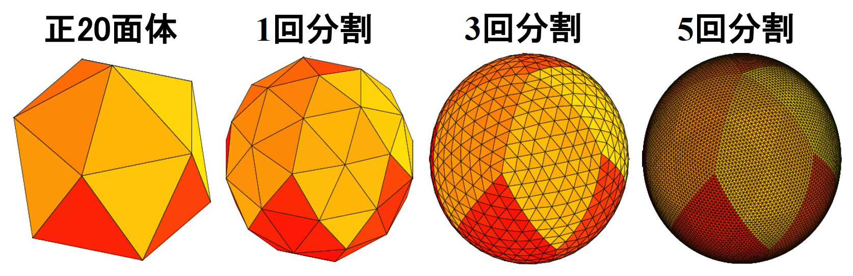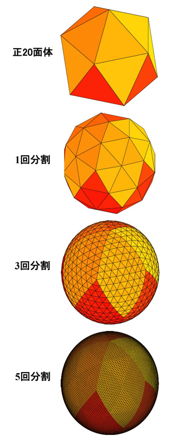 ‥‥‥‥ この全球非静力雲解像モデルは, 来るべき超並列計算機の時代に対応して, 正二十面体格子の分割という方法で自動並列化を行う力学フレームを採用している。 これは, 上述の緯度経度格子による極問題を回避した格子モデルである。 雲微物理過程を含んだ方程式系は三角形を基本とした六角形または五角形の領域をコントロールボリュームに選ぴ, フラックス表示のバランス方程式に基づいた力学コアを採用している。 はじめに, 正二十面体格子を Glevel-O と命名しそのひとつの三角形を4つに分割した格子を Glevel-1 のようによぶことにすると,