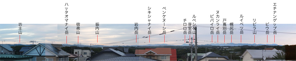 以下,無限遠撮影画像の画角を求める方法を示す。 わたしの場合は,画角を求める無限遠撮影画像をつぎのように定めた: なぜ<連峰の中の山頂>にしたのか? 画角を求めるには,画像の左端にある対象の「東から何度の方向にある」を求めればよい。 これができるためには,画像の左端に,方向を同定できる対象が必ず在らねばならない。 <連峰の中の山頂>は,この条件に適う。 撮影点を,以下Pと呼ぶ。 東北東方向に見える連峰を撮影。 そして,写っている山を地図によって同定: |