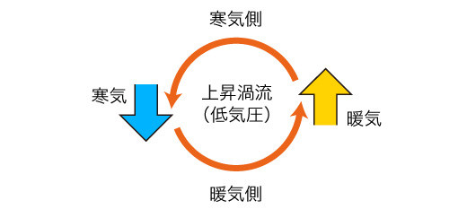このとき寒気側・暖気側があると,つぎのように,渦の回転に沿って寒気流と暖気流が生じる: