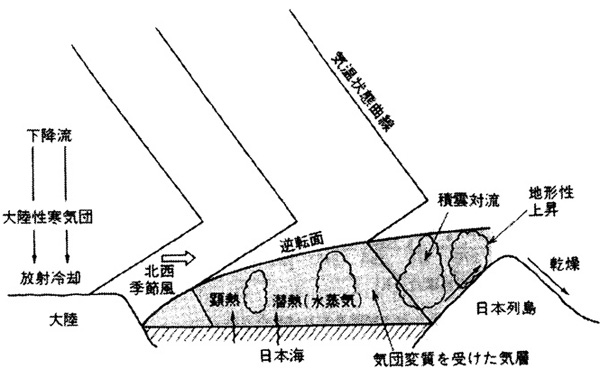 この非常に大きな気温と水温の温度差のため,低温・乾燥・安定であった寒気団が日本海上で変質し,温暖・湿潤化し同時に湿潤断熱減率に近い成層に気団変質する。
