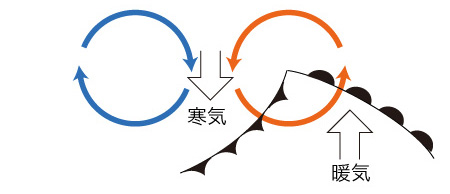 そのスキー場だが,そこに雪が降っていたのは 10〜50年くらい前のことである。 この間の「平均気温」の差は,1度に満たない。 この程度の気温差は,雪が降らなくなるという話にはならない。 干涸らびた畑や雪の降らないスキー場は,「地球温暖化」ではなく「日照時間の増加」の話である。 「日照時間の増加」は,「乾燥化」の話であり,「雲ができにくい」という話である。 「雲ができにくい」は,「熱帯雨林」を想えばわかるように,気温の話ではない。 さてその気温だが,これは日々変化する。 しばしば,大きく変化する。 この変化は,何がどうなっているのか。 これを,ここで解説するとしよう。 空気は流れている。 それが「風」である。 そこで,つぎのようになる: