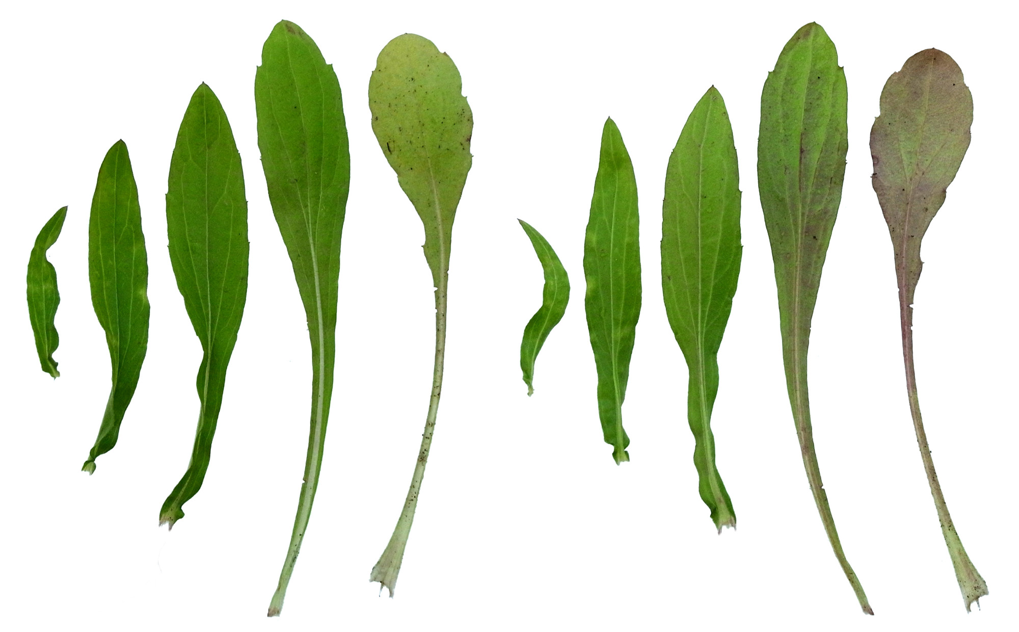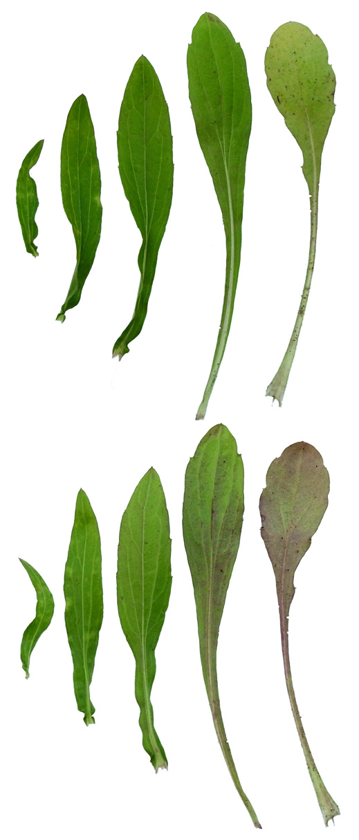 葉の形・大きさの変化 ── 茎の上方から下方へ(画像左から右)