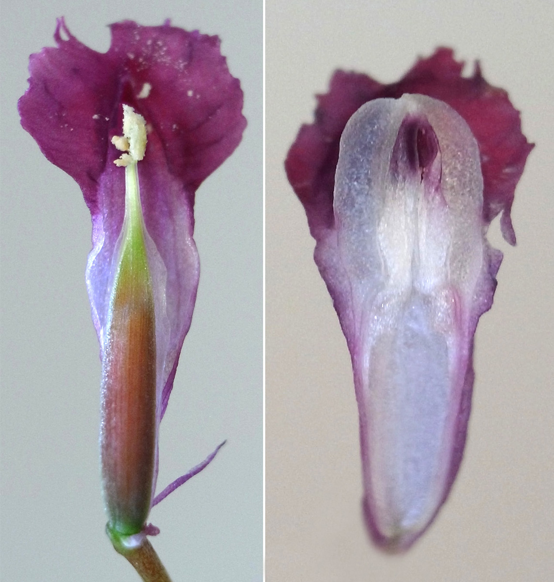 下側の花弁 (右画像) を剥がして,雄しべ・雌しべを現す (左画像)