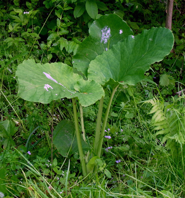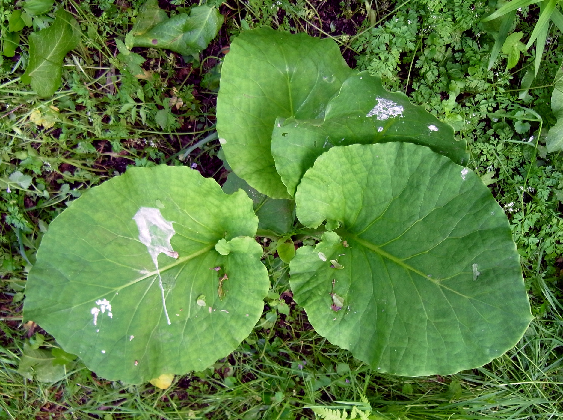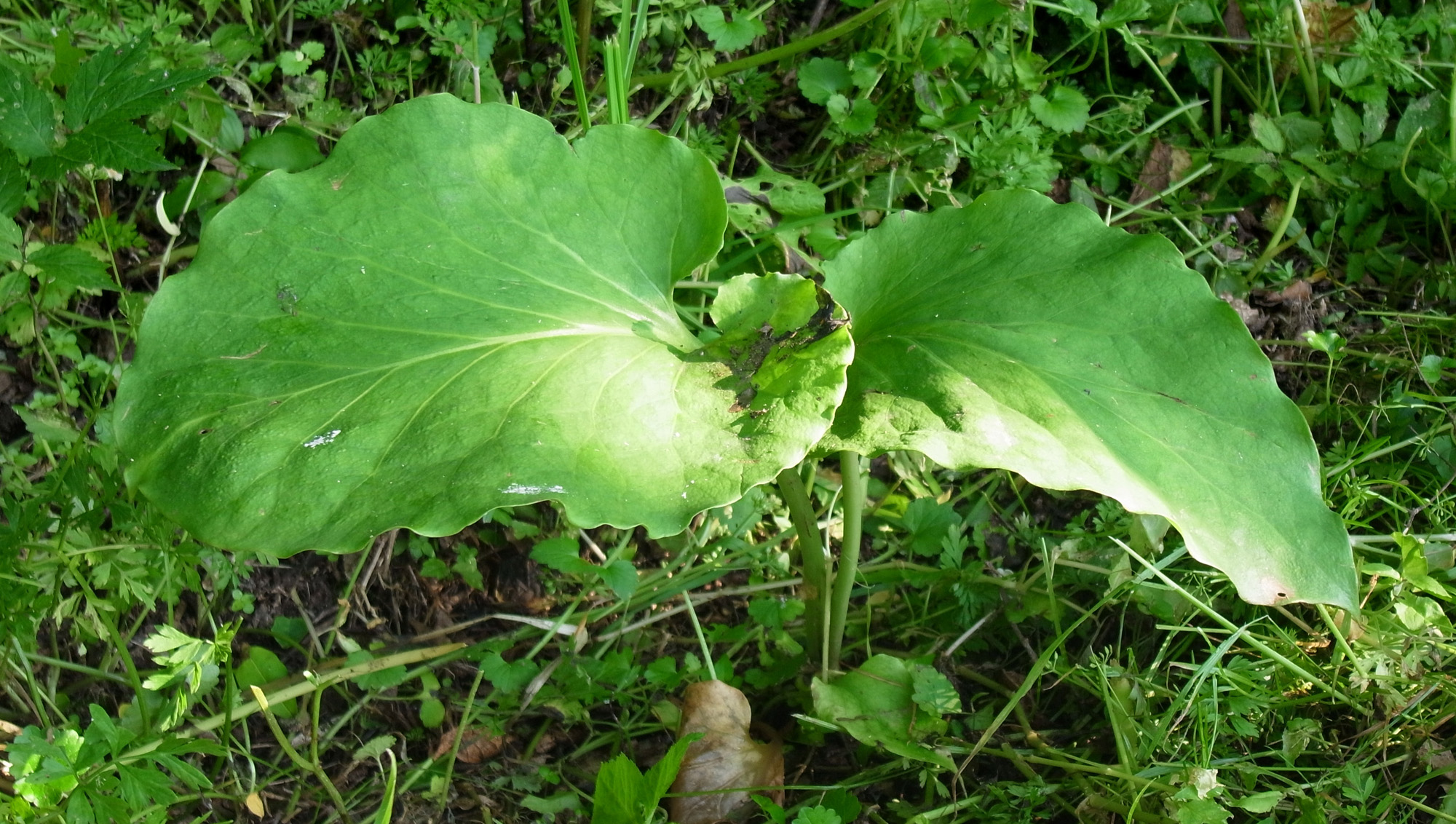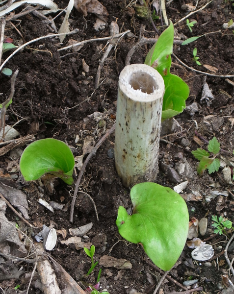昨年は葉が大きくならず,そして萎え,しまいに無くなった。 しかし今年も葉が出ていた──他の草の蔭でつぎの大きさに成長していた(周りの草を刈って,見えるようにした)。 |