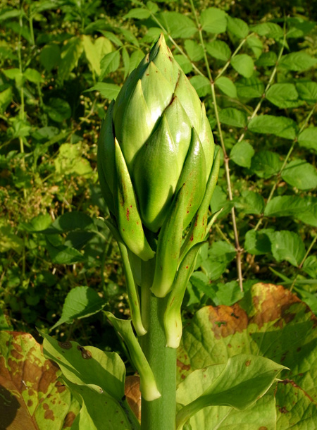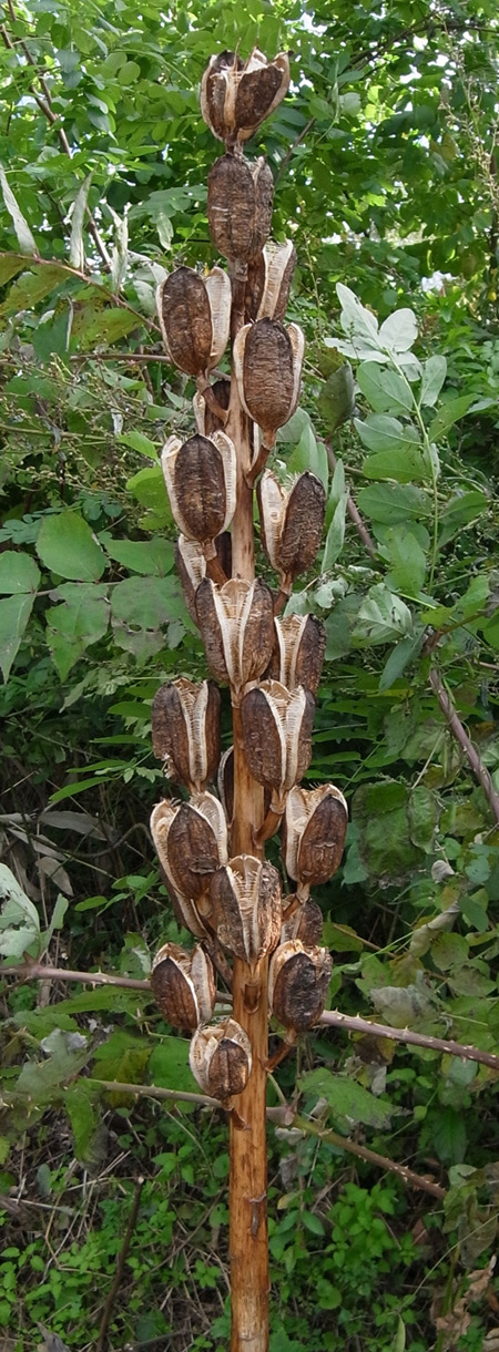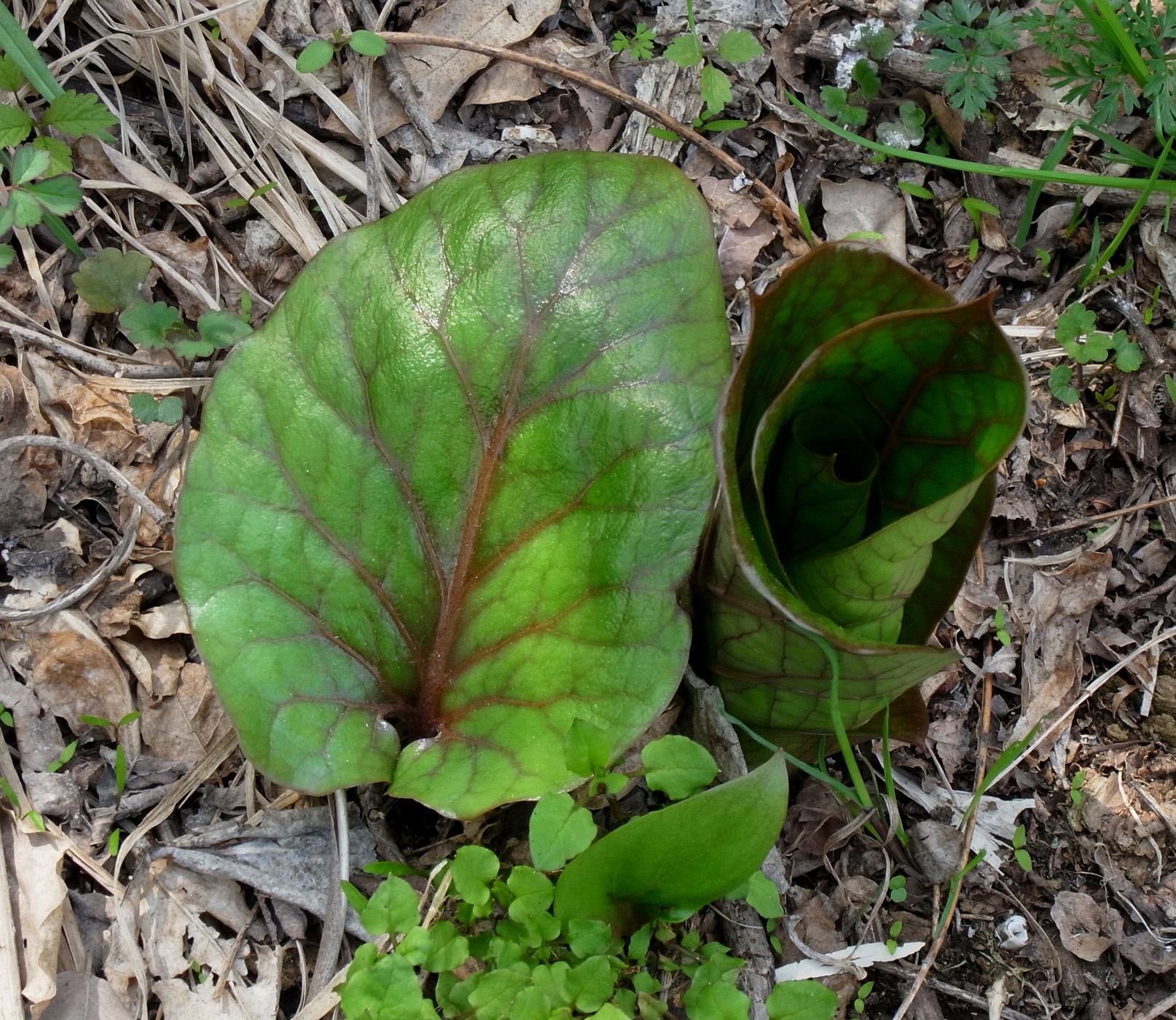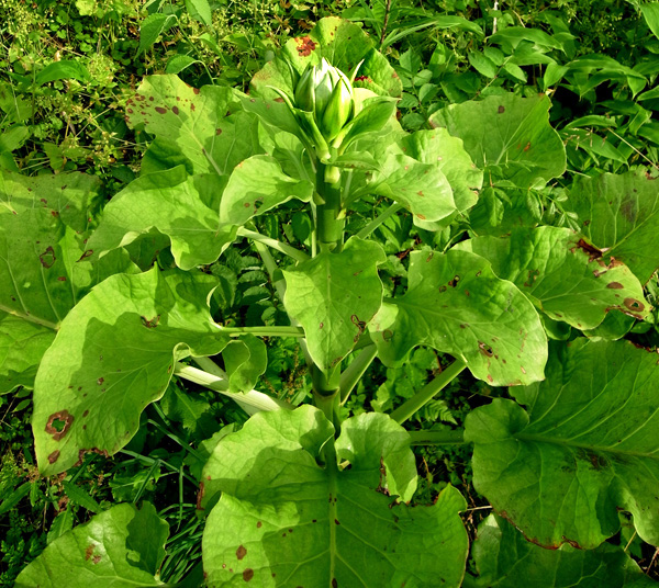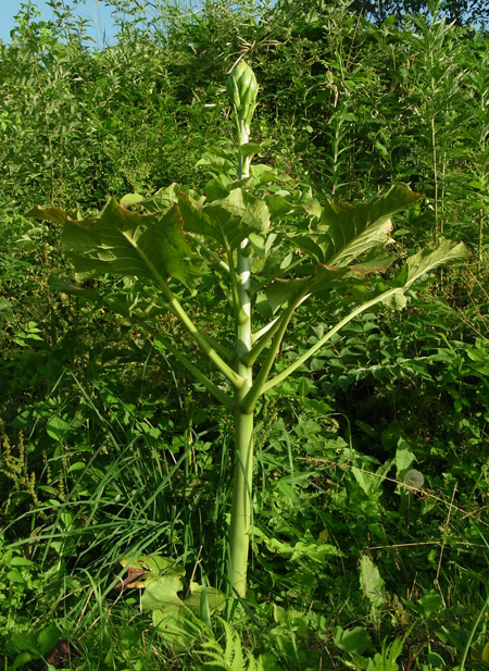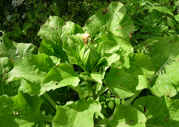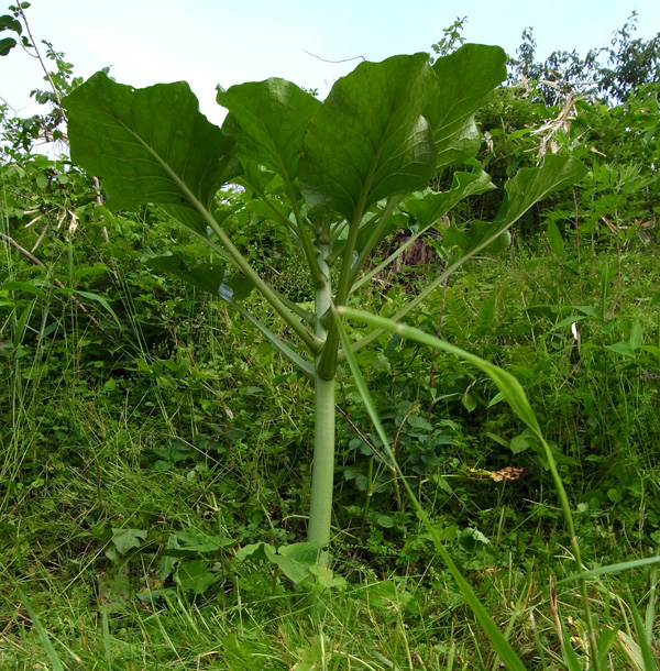 昨年は葉が大きくならず,そして萎え,しまいに無くなった。 しかし今年も葉が出ていた──他の草の蔭でつぎの大きさに成長していた(周りの草を刈って,見えるようにした)。 |