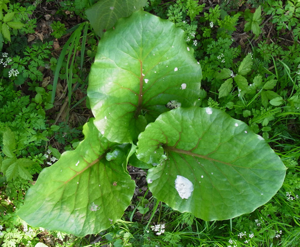 このオオウバユリの真上には電線があり,カラスがよくとまる。 昨年は,カラスの糞害もあって,夏までには萎えてしまい,無くなった。 しかし今年も,葉が出てきた。 |