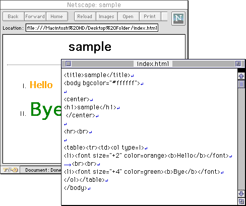 - html文書を,エディタとブラウザの両方で開いて下さい。