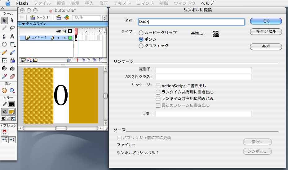 ボタンのアクション (「マウスのクリックで前のフレームに移動」) を定義する。