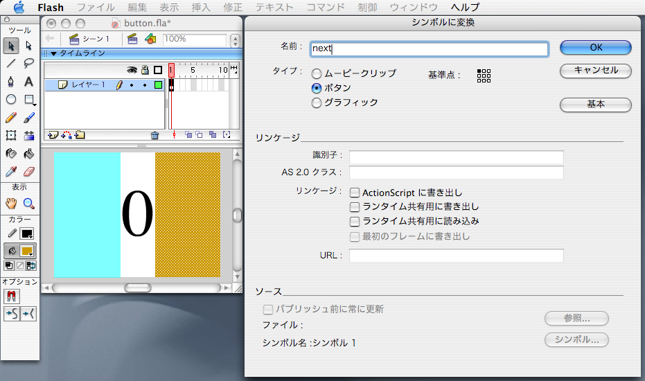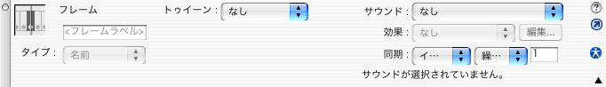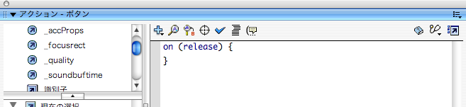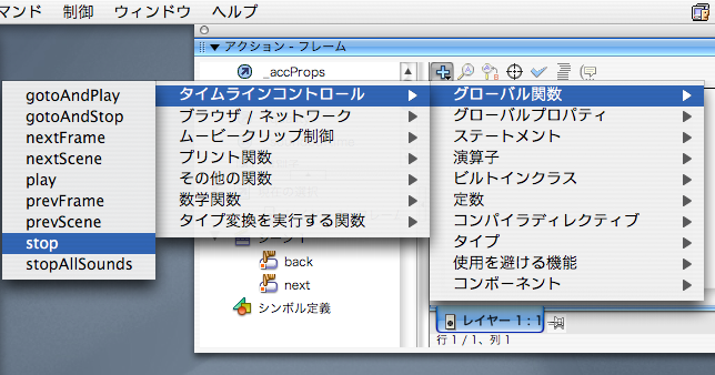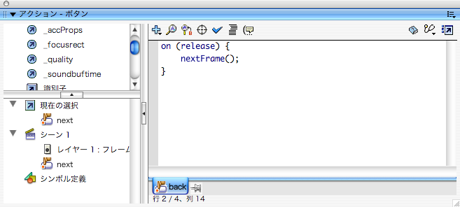 (左のボタンに対して行ったのと同じ操作をして) このボタンのアクションを「nextFrame()」に定義する。
