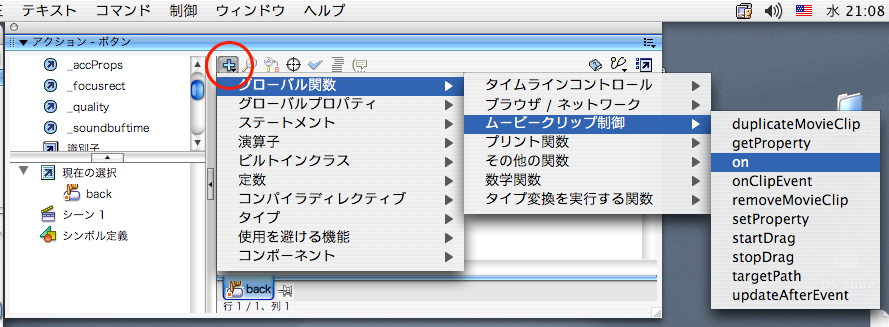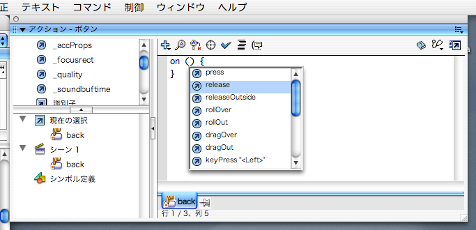これで,「マウスのクリックで前のフレームに移動」のアクションが定義された。