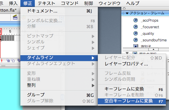 バーメニューの「修正」からつぎのようにたどって,「空白キーフレームに変換」を実行する。
